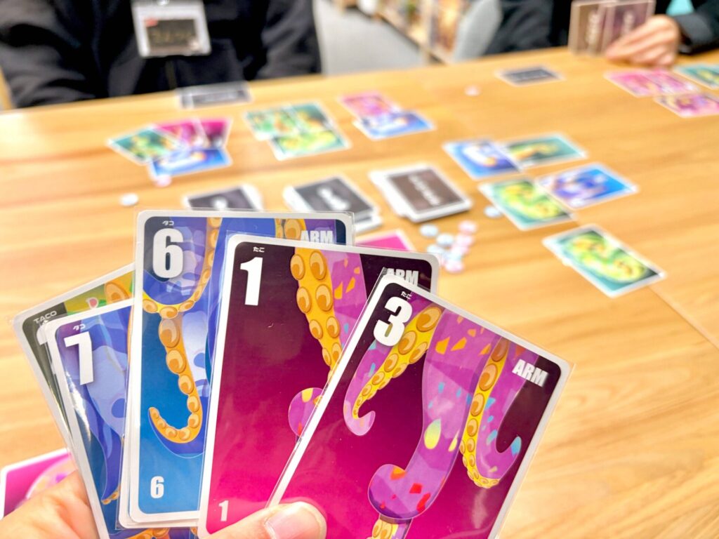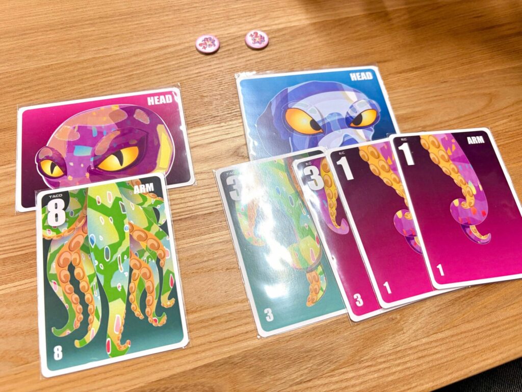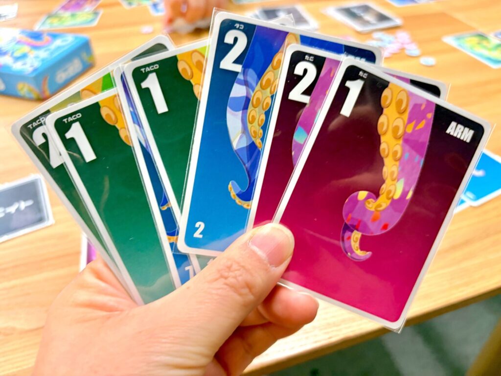 ルールはシンプル。場に並んだ赤・青・緑の「タコの頭」カードに、手札や山札から「足カード」を付けていくだけ。ただし、タコを完成させるには、足カードに書かれた「ランク(本数)」の合計を、過不足なく「8」本ぴったりにしなければなりません!