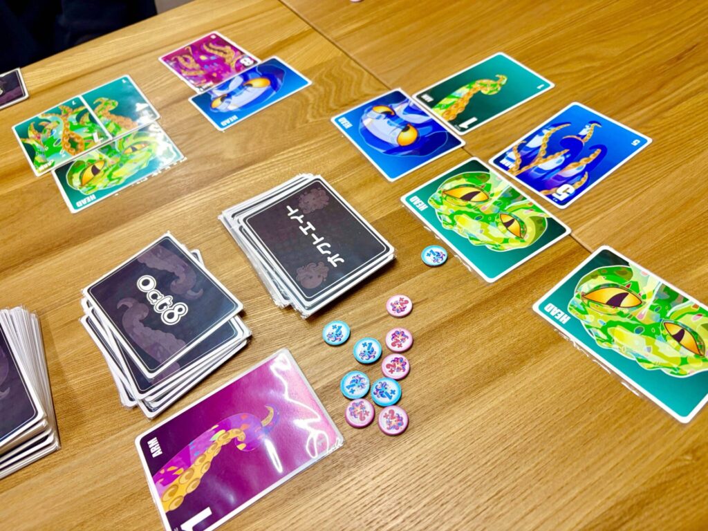 『Oct8(オクトエイト)』は、プレイヤーが「タコ創造の主」となり、退屈した神々のための遊びとして最高のタコを創り出すことを目指すカードゲームです。